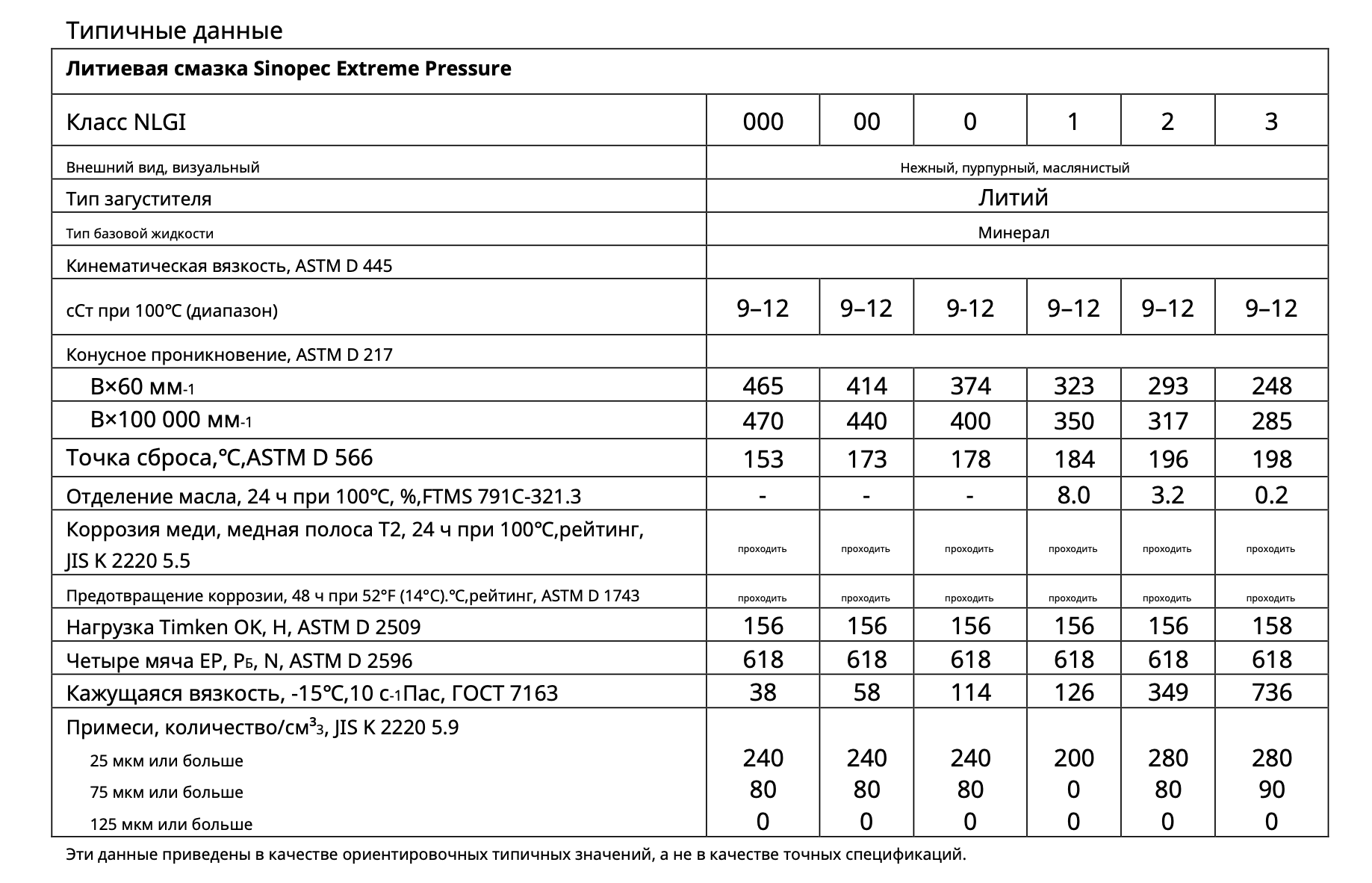 Смазка Sinopec Extreme Pressure Lithium Grease разработана на основе литиевого мыльного загустителя и высококачественного минерального базового масла. Она содержит ингибиторы коррозии и окисления, а также противоизносные и противореваскуляризационные присадки, обеспечивающие превосходные эксплуатационные характеристики и длительный срок службы даже в тяжелых условиях эксплуатации, где возможны высокие температуры, ударные нагрузки и загрязнение водой.